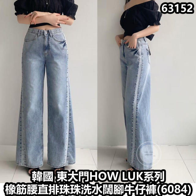 韓國 東大門HOW LUK系列 橡筋腰直排珠珠洗水闊腳牛仔褲(6084)【5件包郵 | 13/3截單 | 預計4月中至尾到貨 | 20260308B(63152.)】