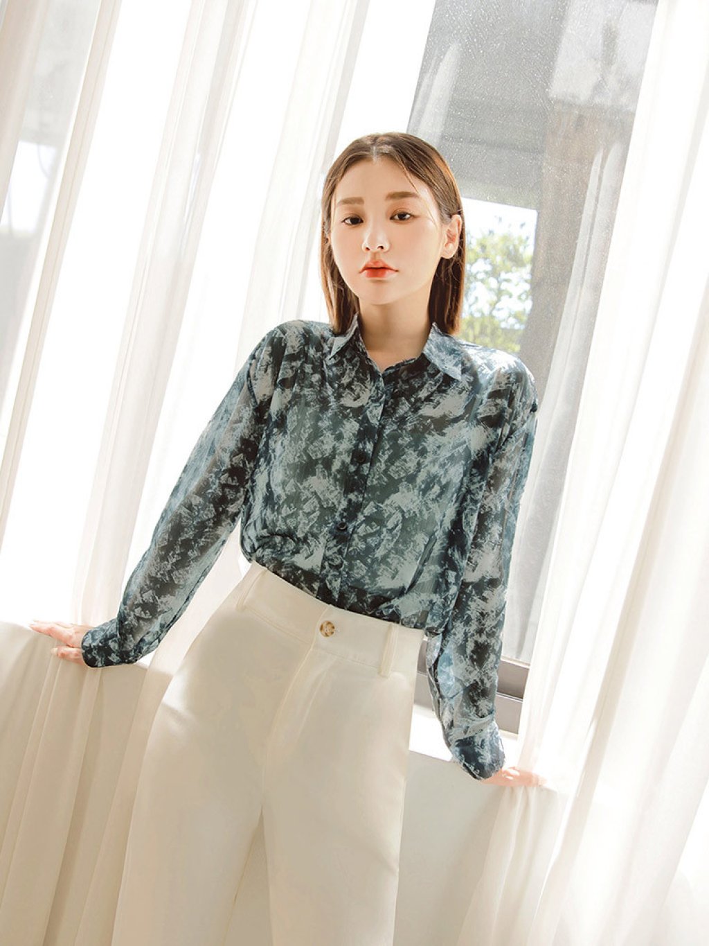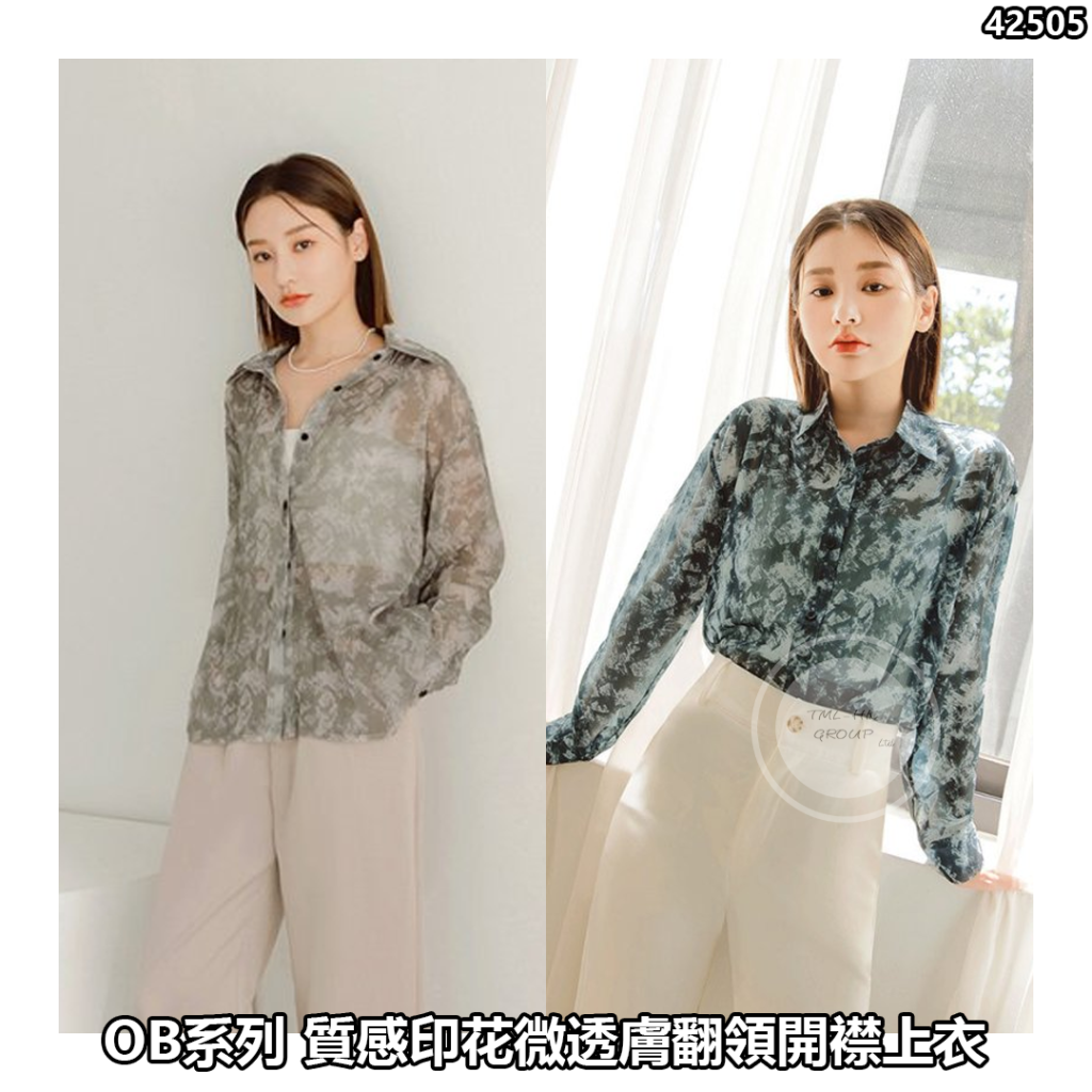 42505.台灣連線 OB系列 質感印花微透膚翻領開襟上衣 (AB17626)