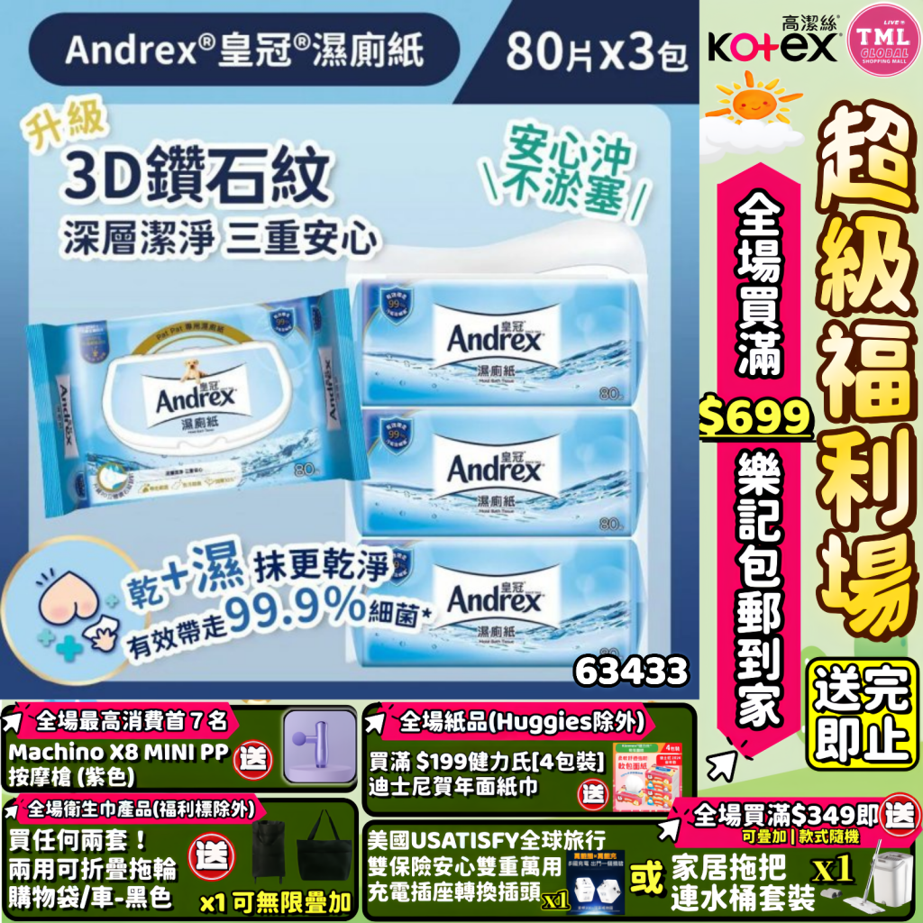 生活用品專場 Andrex 濕廁紙(80片X3包)【買滿$699包郵樂記 | 19/3截單 | 預計4月中至尾到貨 | 20260314(63433.)】