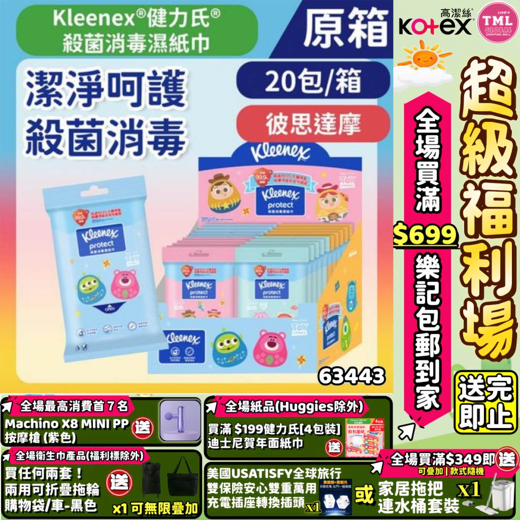 主頁 生活用品專場 Kleenex 迪士尼彼思達摩殺菌消毒濕紙巾10片裝(原箱20包)【買滿$699包郵樂記 | 19/3截單 | 預計4月中至尾到貨 | 20260314(63443.)】