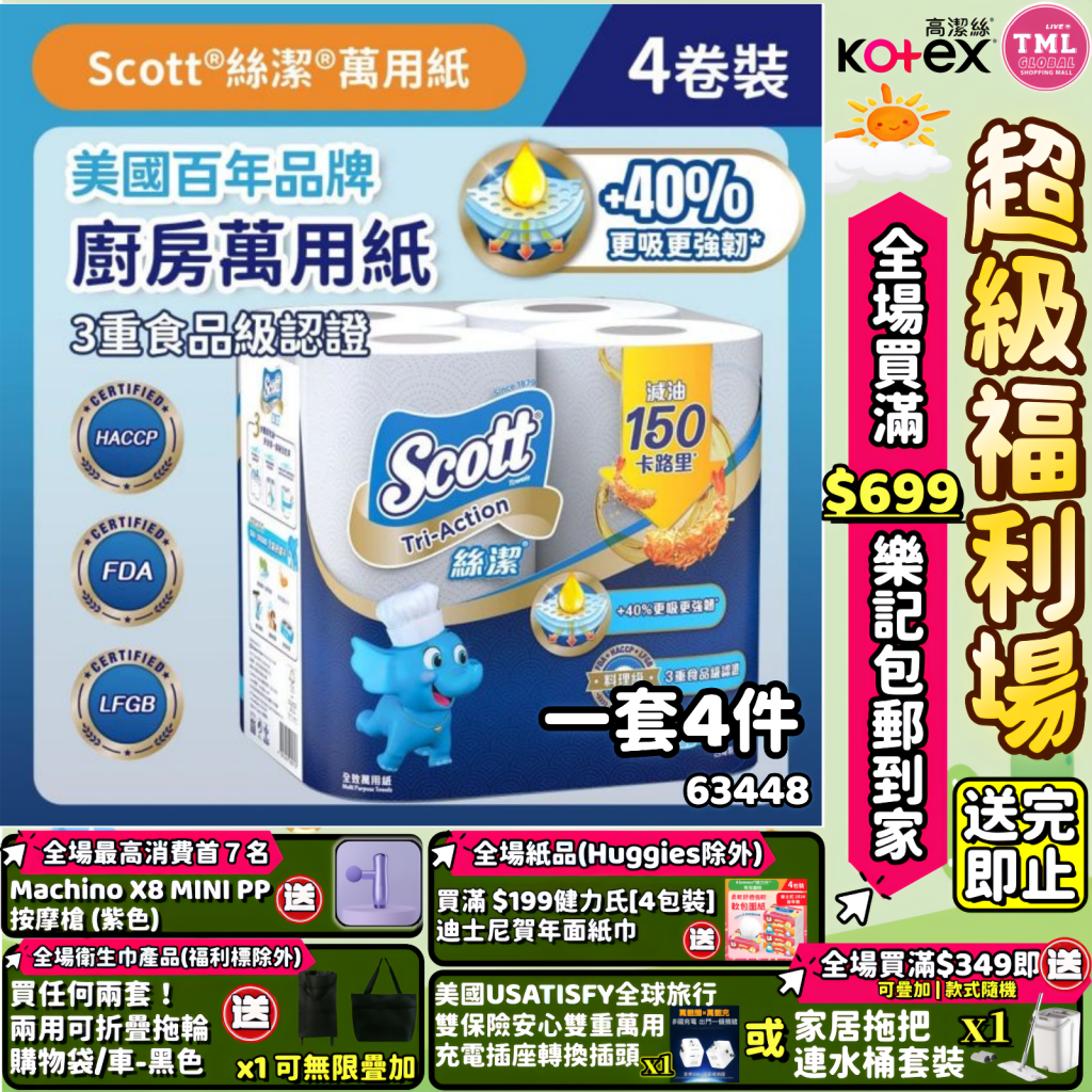 主頁 生活用品專場 Scott 廚房全效萬用紙4卷裝(1SET 4包 包裝隨機出貨)【買滿$699包郵樂記 | 19/3截單 | 預計4月中至尾到貨 | 20260314(63448.)】