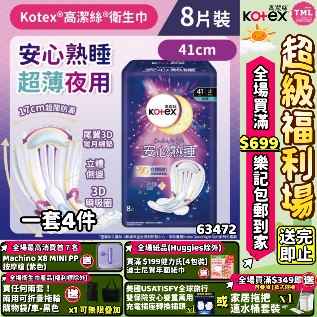 生活用品專場 Kotex 安心熟睡超薄夜用裝衛生巾(41cmX8片 敏感肌適用)(1SET 4件)【買滿$699包郵樂記 | 19/3截單 | 預計4月中至尾到貨 | 20260314(63472.)】