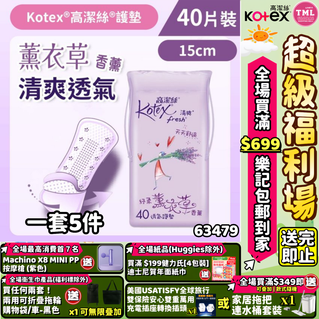 主頁 生活用品專場 Kotex 清爽透氣薰衣草護墊(15cmX40片)(1SET 5件)【買滿$699包郵樂記 | 19/3截單 | 預計4月中至尾到貨 | 20260314(63479.)】